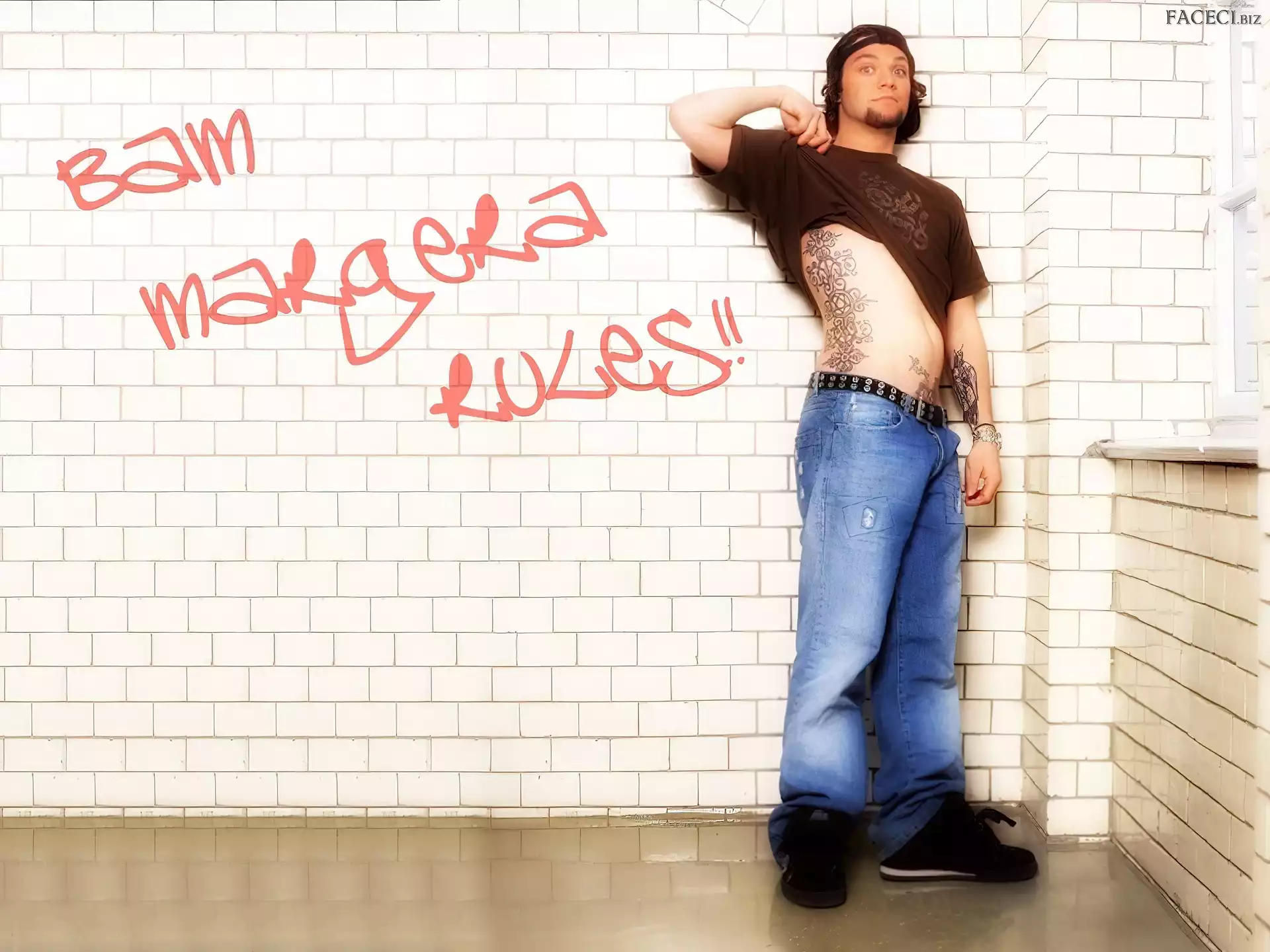 kurtka, Bam Margera, rozpięta okulary, Bam Margera, butelka zegarek, Bam Margera, deskorolka włosy, Bam Margera, ciemne okulary, Bam Margera, twarze t-shirt, Bam Margera, brązowy